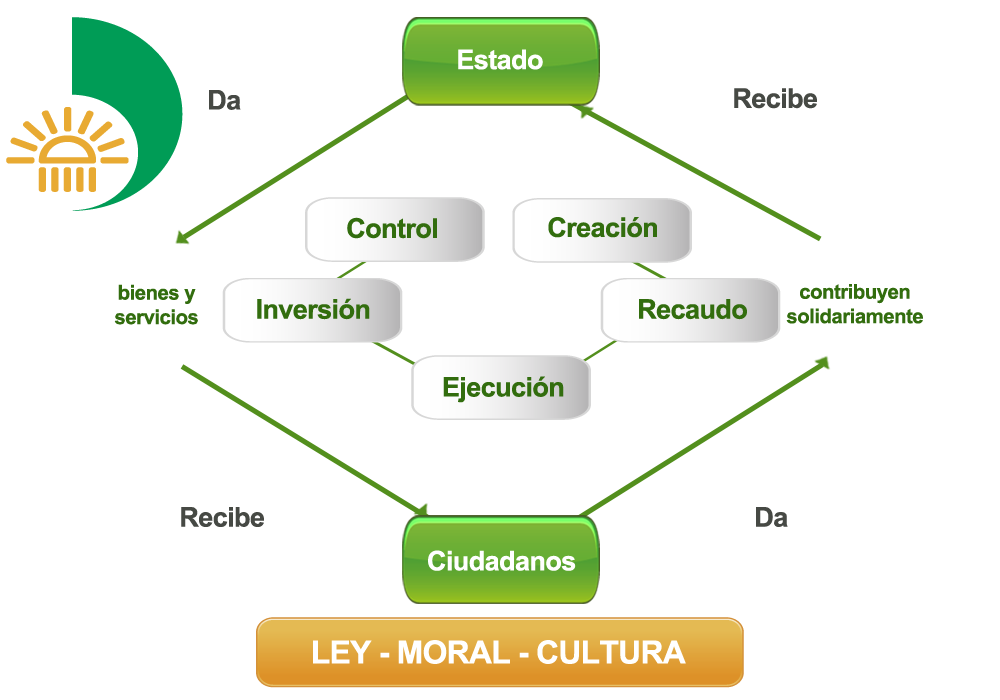 Teniendo en cuenta los conceptos trabajados en esta unidad, de Estado Social de Derecho, sociedad, ciudadanía, hacienda pública, cultura, responsabilidad social, y la representación gráfica del ciclo de la contribución, le solicitamos lo siguiente: