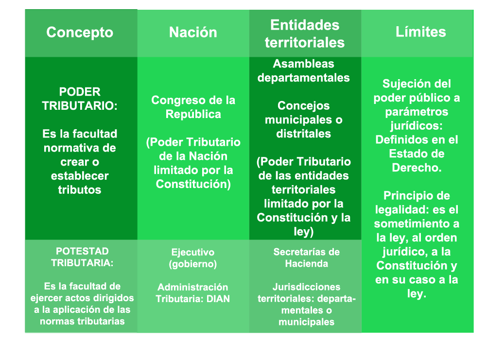 En el siguiente esquema se plantean las diferencias. La intención es mostrar la forma cómo el poder y la potestad tributarios tienen su expresión en la nación, en el nivel territorial y cuáles son los límites. En la primera columna está el concepto, en la segunda el nivel nacional, en la tercera el nivel de las entidades territoriales y en la cuarta los límites para la actuación de cada poder. |